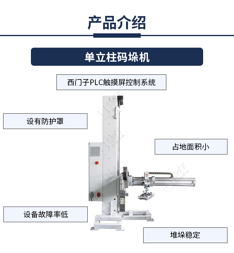 3. 單柱碼垛設(shè)計使設(shè)備占地面積小,有利于在空間有限的場所進(jìn)行安裝和布局,并且方便后續(xù)的設(shè)備維護(hù)工作。